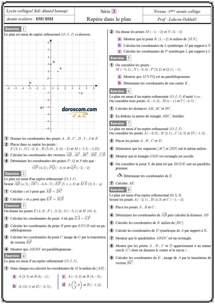 Repère dans le plan – 3ème Année CollègeExercice01