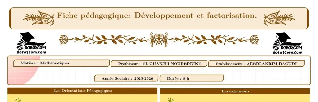 يسر موقع DOROSCOM أن يضع بين أيدي الأساتذة والتلاميذ مورداً تعليمياً عالي الجودة، يتمثل في الجذاذة التربوية لدرس النشر والتعميل (cours Développement et factorisation) الخاصة بمستوى السنة الأولى ثانوي إعدادي مسار دولي. هذه الوثيقة، التي أعدها الأستاذ المنجلي نور الدين، تأتي لتستجيب للتوجيهات التربوية الحديثة التي تروم تبسيط المفاهيم الجبرية وربطها بالواقع الهندسي.