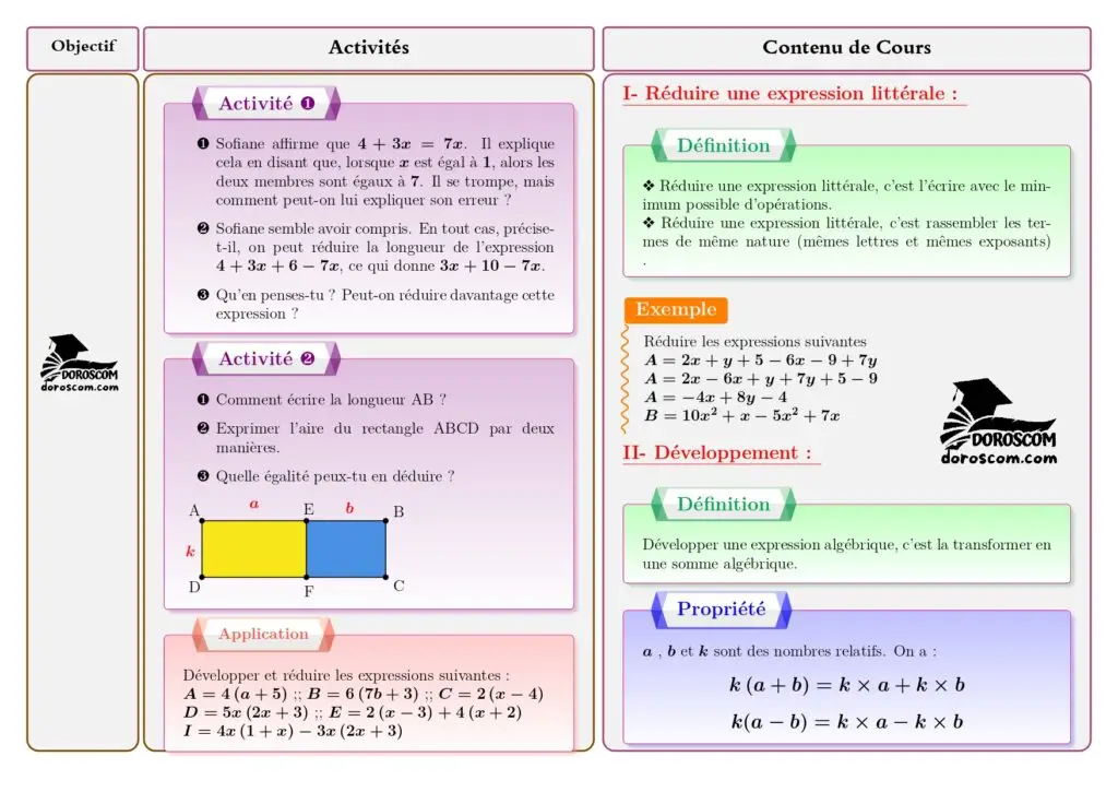 - تبسيط التعبيرات الحرفية (Réduire): تمكين التلميذ من مهارة تجميع الحدود المتشابهة لتقليص حجم العمليات الجبرية.