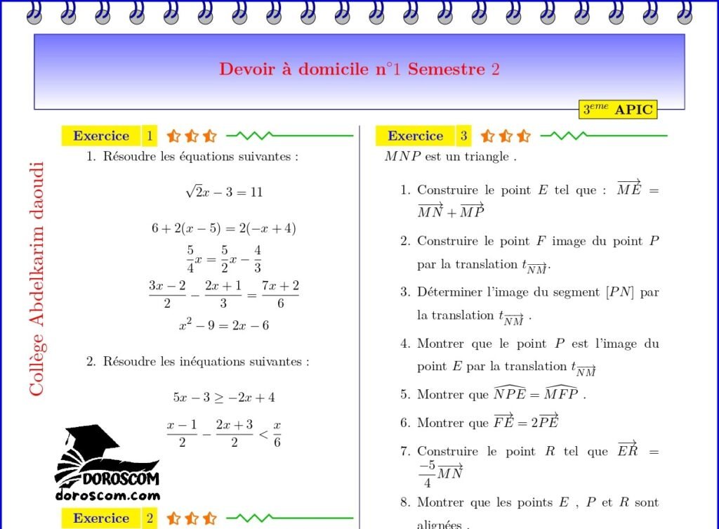 يفتتح تلاميذ السنة الثالثة ثانوي إعدادي (مسار دولي) الأسدس الثاني بدروس محورية تجمع بين الجبر والهندسة. ولمساعدة التلاميذ على التحضير الجيد، يسر موقع DOROSCOM أن يضع بين أيديكم الفرض المنزلي رقم 1 (Devoir à domicile N°1)، الذي أعده الأستاذ المنجلي نور الدين بعناية فائقة ليشمل جميع الكفايات المستهدفة في هذه المرحلة.